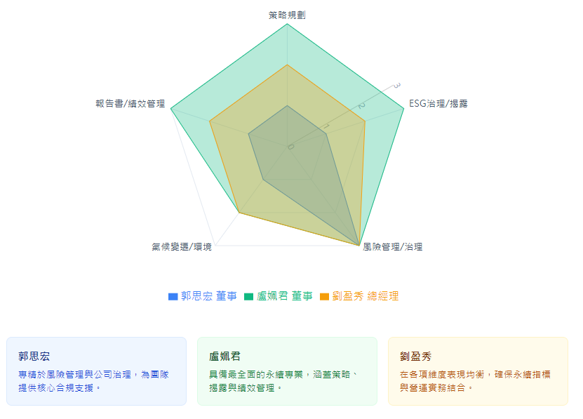 本委員會成員由董事及高階管理階層組成,具備永續策略規劃、ESG治理、風險管理、氣候議題與永續資訊揭露等多元專業背景,以確保公司永續發展與風險管理機制之有效推動。