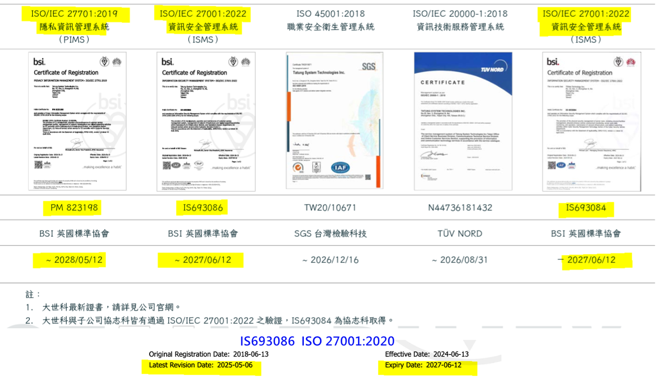 » 2024 年 8 月起依據 ISO/IEC 27701:2019 國際標準,建立隱私資訊管理制度(PIMS),確保企業符合法規要求與外部關注方的隱私保護需求,提升隱私合規管理能力。並將ISO/IEC27001:2022 與ISO/IEC 27701:2019 整合為一體化管理框架,以簡化流程並提升效率。