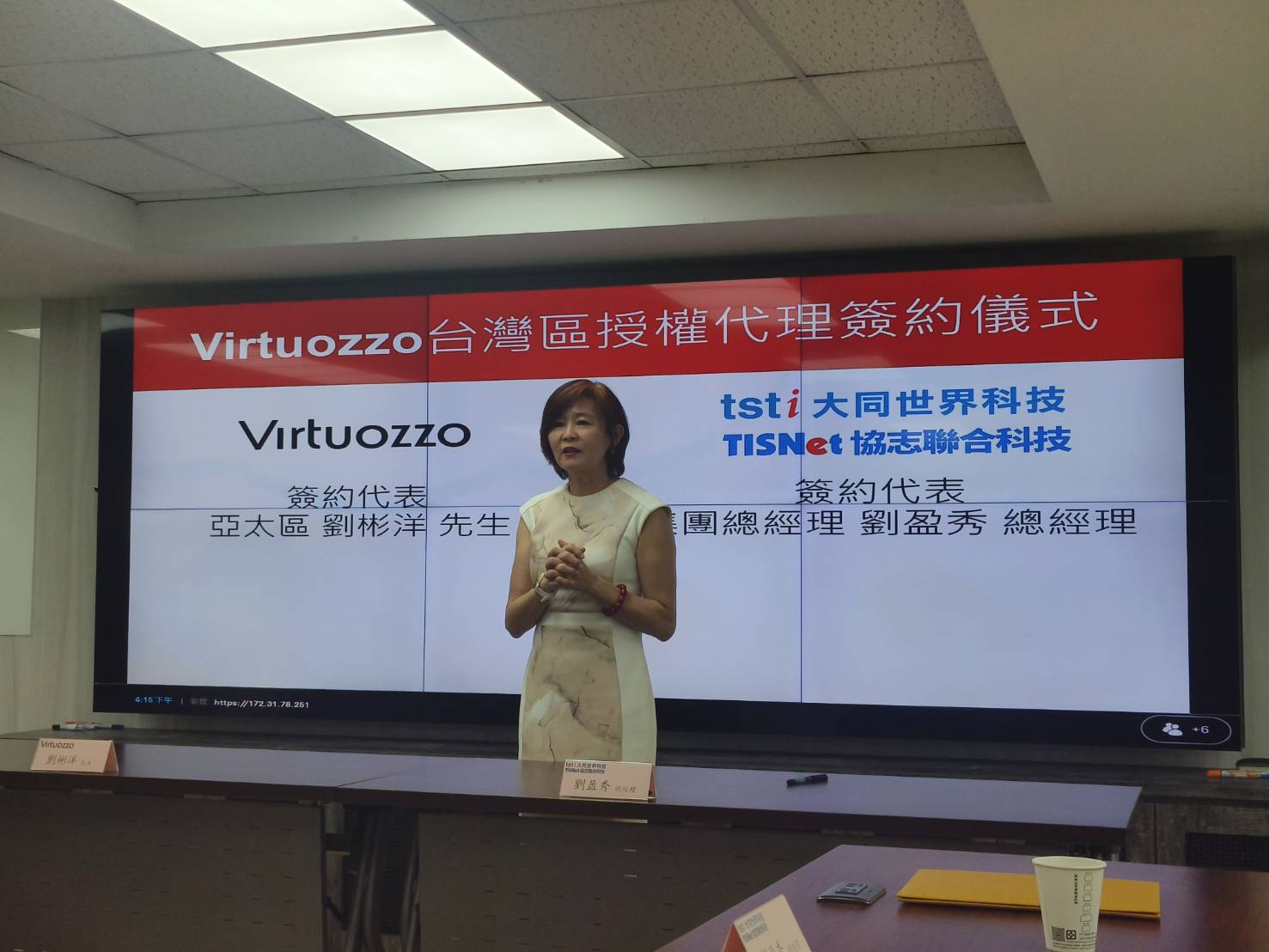 大世科集團總經理劉盈秀代表子公司協志聯合TISNeT與瑞士商Virtuozzo 簽約台灣區代理儀式中致詞。
