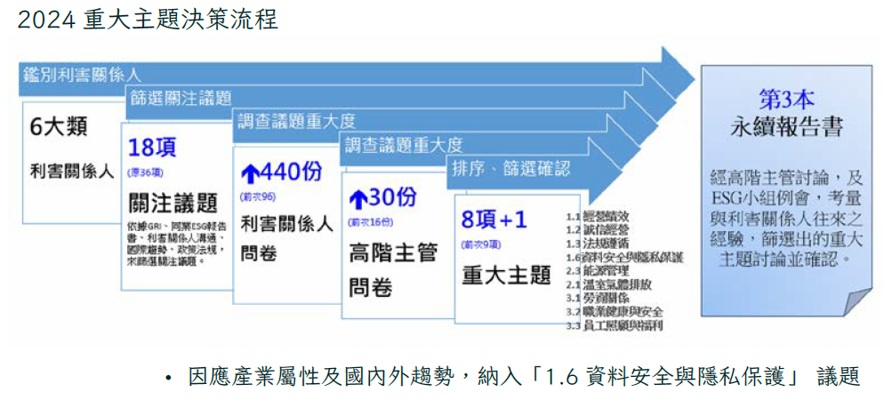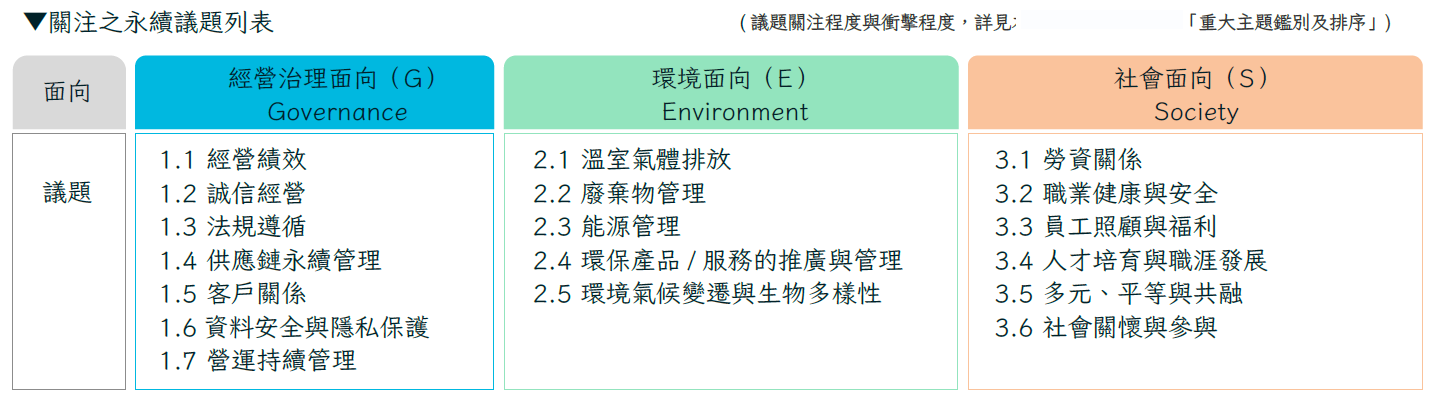 2024 年度將2023 年原有之36 項關切主題,經永續推動小組及高階主管討論後合併精簡,彙整經營治理面向7 個、環境面向5 個、社會面向6 個,總計18 項永續議題,成為本年度問卷之18 項主題問項,最終設計出《大世科企業永續利害關係人關切主題問卷》進行調查。