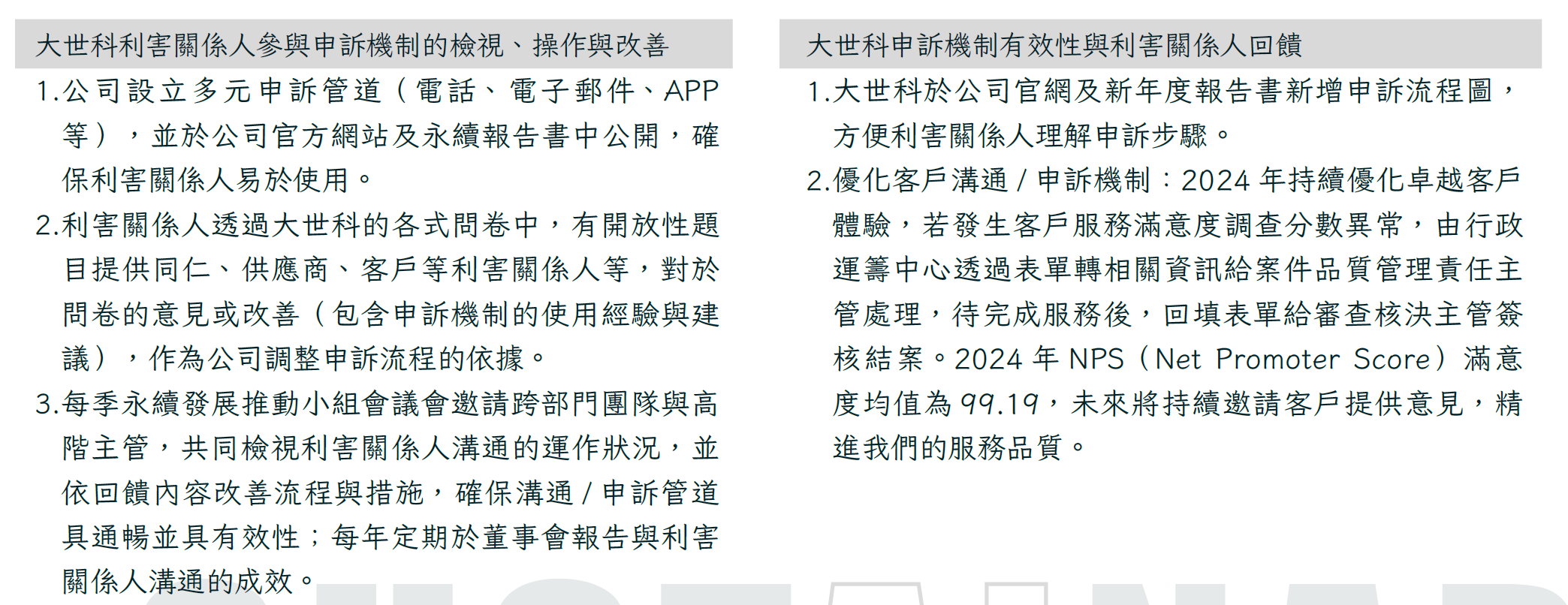 大世科提供利害關係人之溝通管道,供其詢問及發表意見。為更加瞭解利害關係人所關注的面向,且對其造成衝擊之議題,我們除工作實務的經驗與觀察外,本公司擁有多元內外部積極的溝通管道,提供利害關係人進行詢問及發表意見,藉由不同方式來蒐集並回應其所關注之議題。詳細資訊請見官網「利害關係人>溝通申訴管道與窗口」。