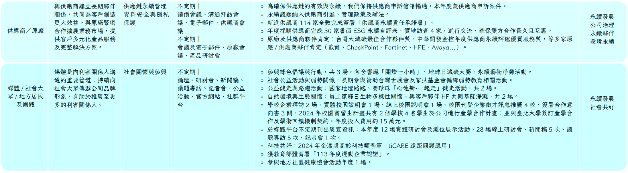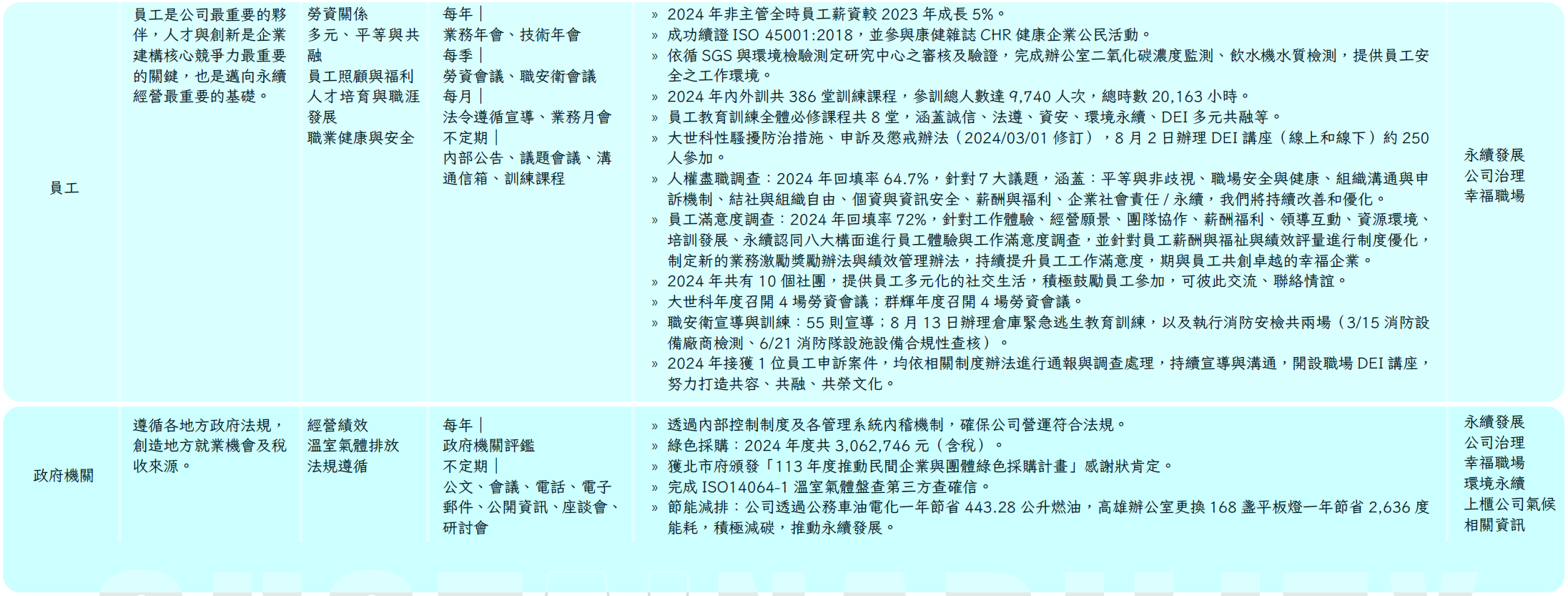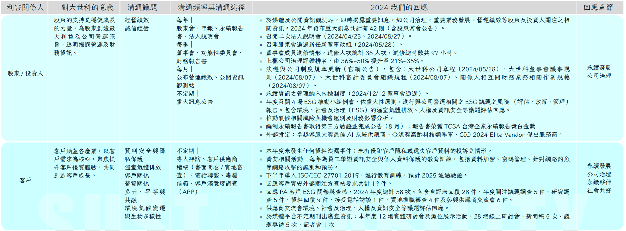 我們根據各部門及同業的經驗,並參考國際標準AA 1000 利害關係人議合原則,鑑別出6 大關鍵利害關係人,包括:(1)股東/ 投資人、(2)客戶、(3)員工、(4)政府機關、(5)供應商/ 原廠、(6)媒體/ 社會大眾/ 地方居民及團體。我們建立各種溝通管道,積極溝通,減少對立與誤解;並且,藉由分析重要利害關係人與其關心之重要議題,避免利害關係人與本公司立場不同,造成誤解引起經營或訴訟風險。永續推動小組分析2024 年度大世科與利害關係人的溝通情形於ESG 永續發展組織例會中討論,並經彙整後呈報2024 年第四季董事會。
