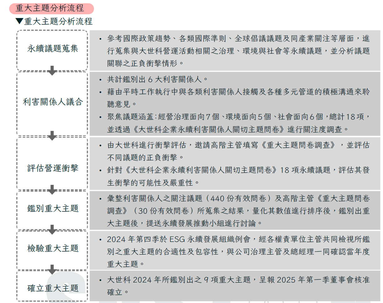 大世科在蒐集議題過程中,響應聯合國永續發展目標(SDGs)及聯合國全球盟約(UN Global Compact)倡議之議題,並依全球永續性報告協會(Global Reporting Initiative, GRI)之GRI Standard 及永續會計準則委員會(Sustainability Accounting Standards Board, SASB)之行業準則產業特性(軟體與資訊科技服務,Software & IT Services)為考量基礎;同時,透過分析標竿企業與同產業關注議題,進行永續議題整併來符合資訊服務業永續發展現況。